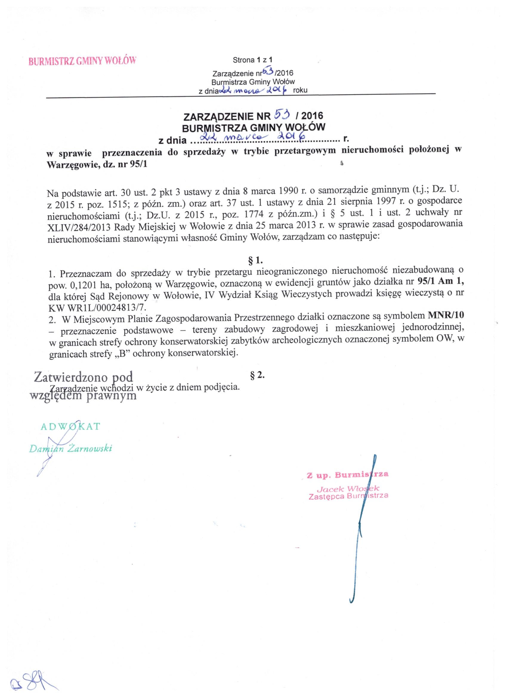 | Ilość odwiedzin: | 2501 | | Nazwa dokumentu: | 53 / 2016 | | Skrócony opis: | Zarządzenie w sprawie przeznaczenia do sprzedaży w trybie przetargowym nieruchomości położonej w Warzęgowie, dz. nr 95/1. | | Podmiot udostępniający: | Burmistrz Gminy Wołów | | Osoba, która wytworzyła informację: | Joanna Białkowska | | Osoba, która odpowiada za treść: | Joanna Białkowska | | Osoba, która wprowadzała dane: | Joanna Białkowska | | Data wytworzenia informacji: | 2016-03-22 09:23:51 | | Data udostępnienia informacji: | 2016-03-22 09:23:51 | | Data ostatniej aktualizacji: | 2016-03-22 09:34:20 |