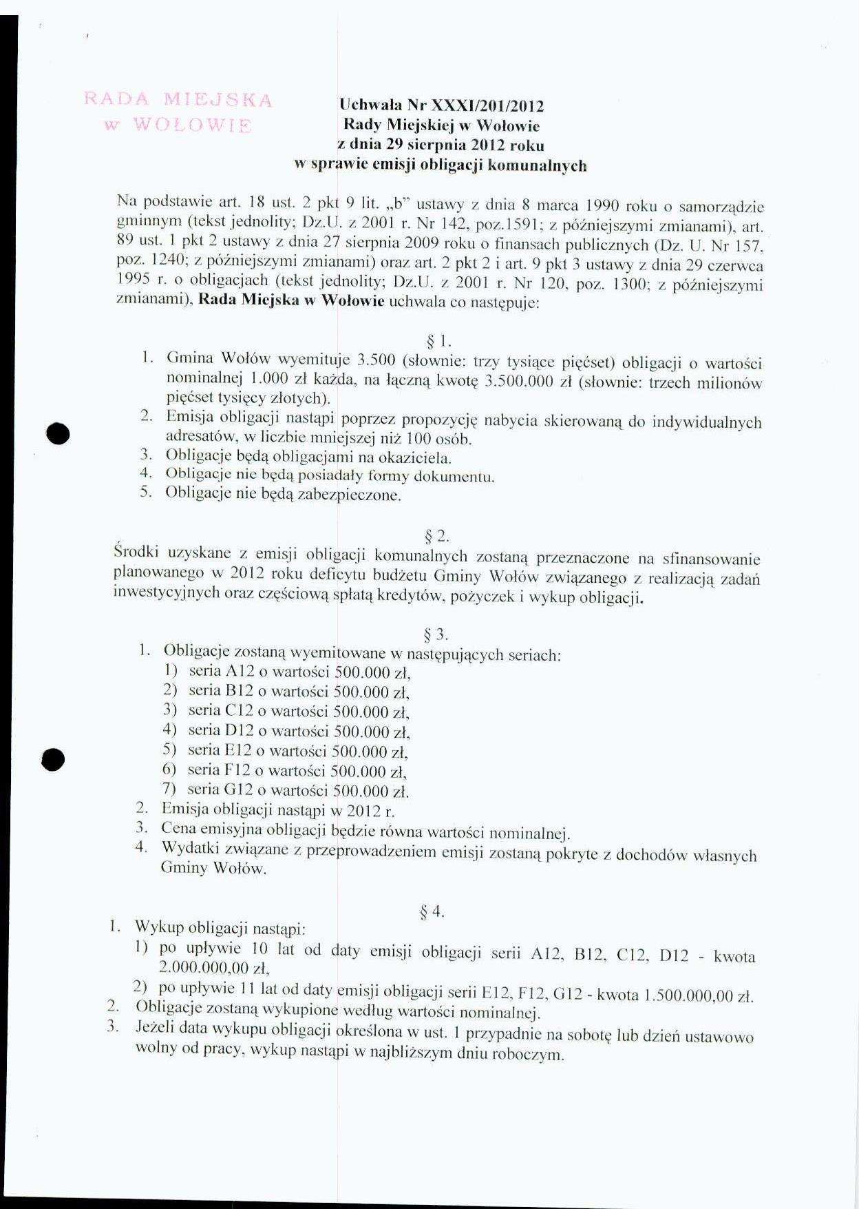 | Nazwa dokumentu: | Uchwała Nr XXXI/201/2012 Rady Miejskiej w Wołowie z dnia 29 sierpnia 2012 r. w sprawie emisji obligacji komunalnych |