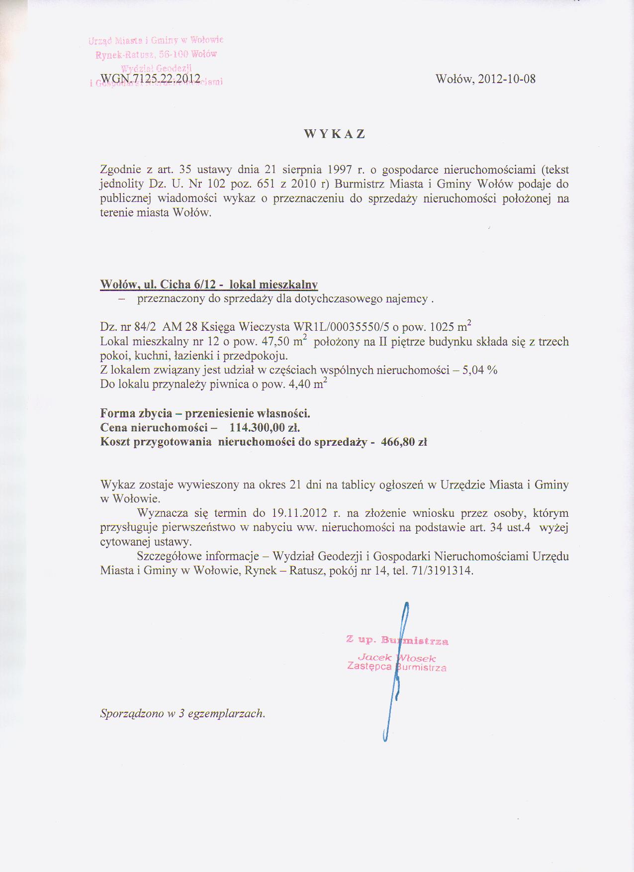 | Ilość odwiedzin: | 3535 | | Nazwa dokumentu: | Wołów, ul. Cicha 6/12 | | Skrócony opis: | sprzedaż bezprzetargowa na rzecz najemcy lokalu mieszkalnego | | Podmiot udostępniający: | Burmistrz Miasta i Gminy Wołów | | Osoba, która wytworzyła informację: | Ewa Olcha | | Osoba, która odpowiada za treść: | Ewa Olcha | | Osoba, która wprowadzała dane: | Ewa Olcha | | Data wytworzenia informacji: | 2012-10-11 15:09:49 | | Data udostępnienia informacji: | 2012-10-11 15:09:49 | | Data ostatniej aktualizacji: | 2012-10-11 15:20:12 |