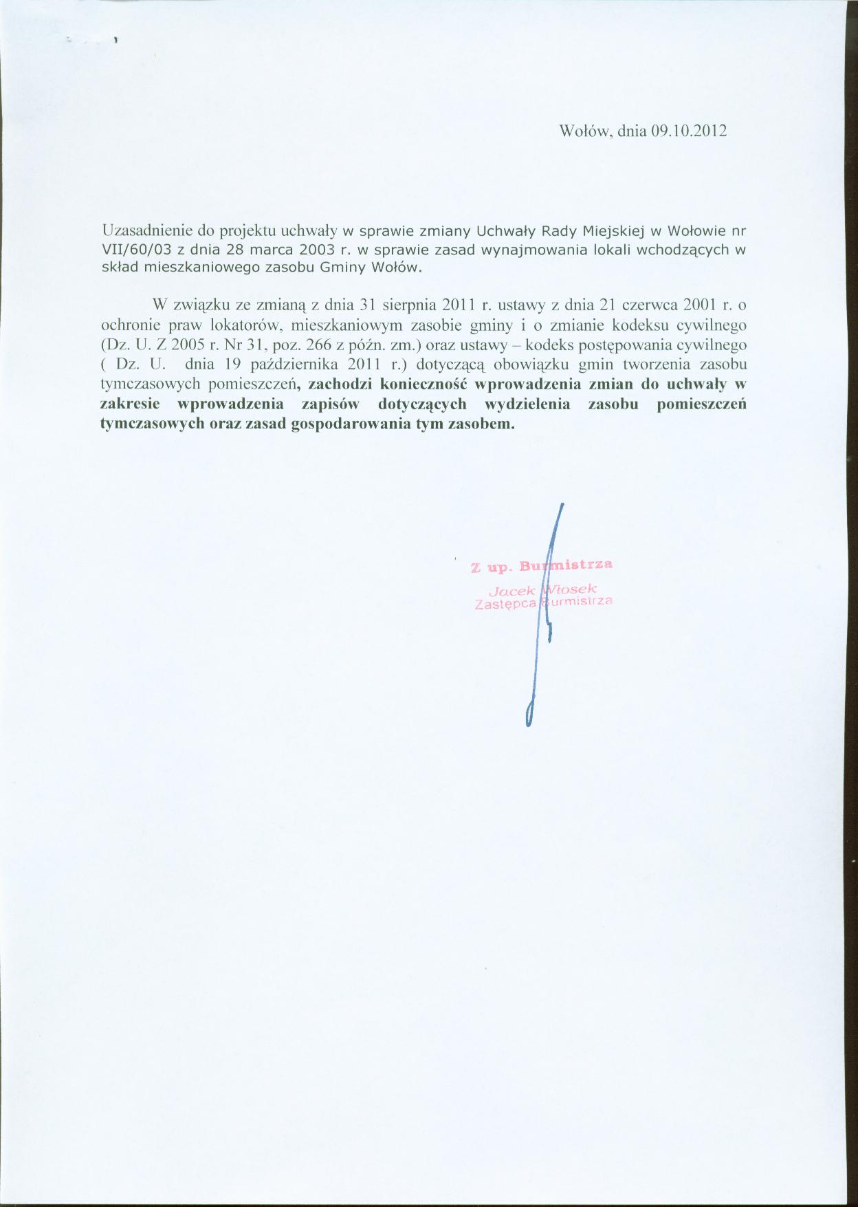 | Nazwa dokumentu: | Projekt uchwały w sprawie zmiany Uchwały Rady Miejskiej w Wołowie nr VII/60/03 z dnia 28 marca 2003 r. w sprawie zasad wynajmowania lokali wchodzących w skład mieszkaniowego zasobu Gminy Wołów |