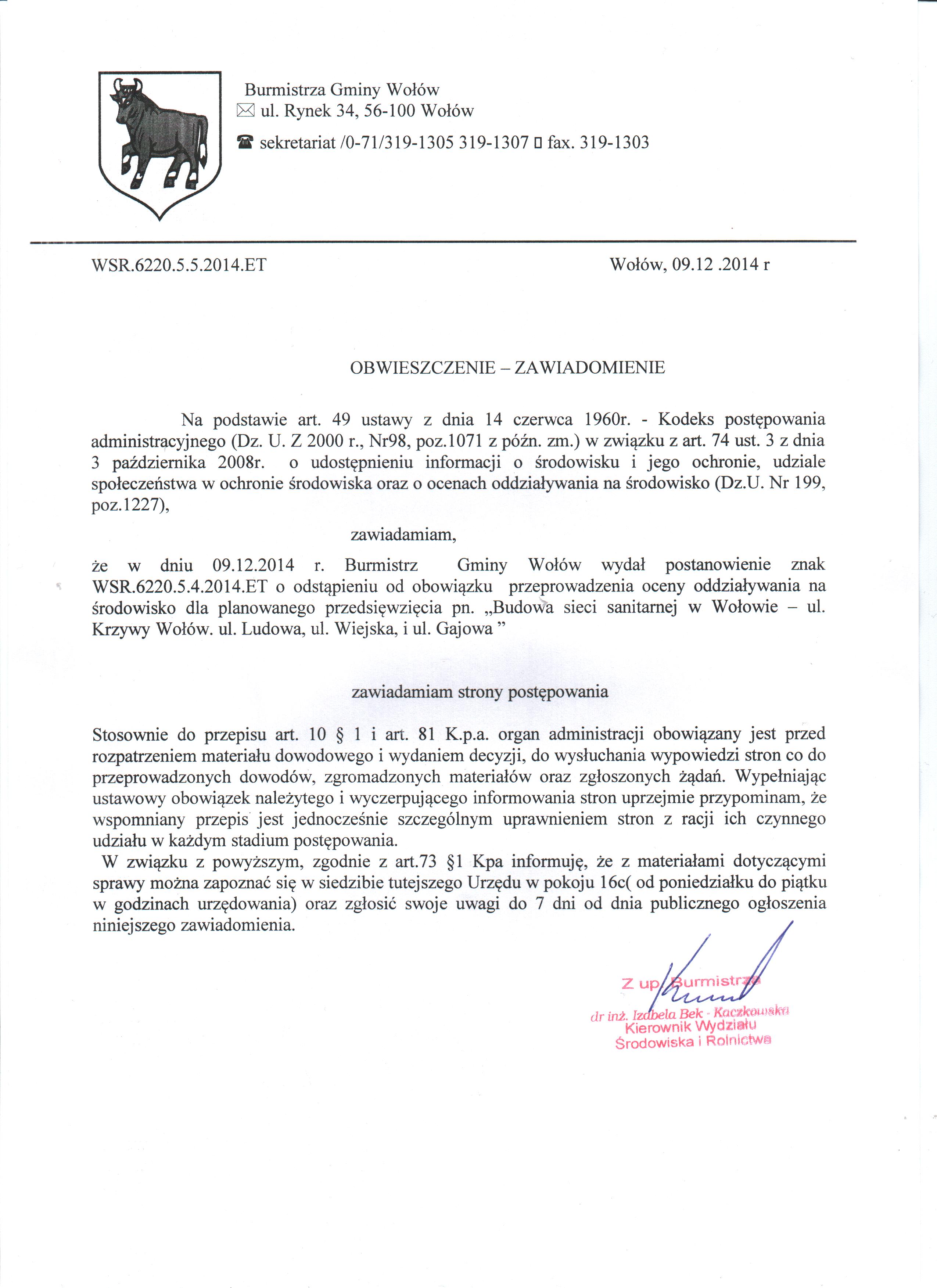 | Skrócony opis: | Obwieszczenie Burmistrza Gminy Wołów w sprawie wydania postanowienia o odstąpieniu od obowiązku przeprowadzenia oceny oddziaływania na środowisko dla planowanego przedsięwzięcia pn. "Budowa sieci sanitarnej w Wołowie - ul. Krzywy Wołów, ul. Ludowa, ul. Wiejska i ul. Gajowa". |